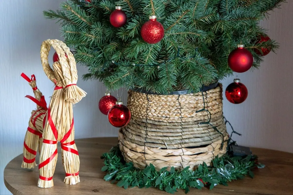 Aseta kuusen alle kirjailtu pyöreä juuttimatto tai jos haluat ripauksen yllätyksellisyyttä, sijoita kuusenjalka retroon pärekoriin, joka voi toimia samalla myös joululahjakorina.
